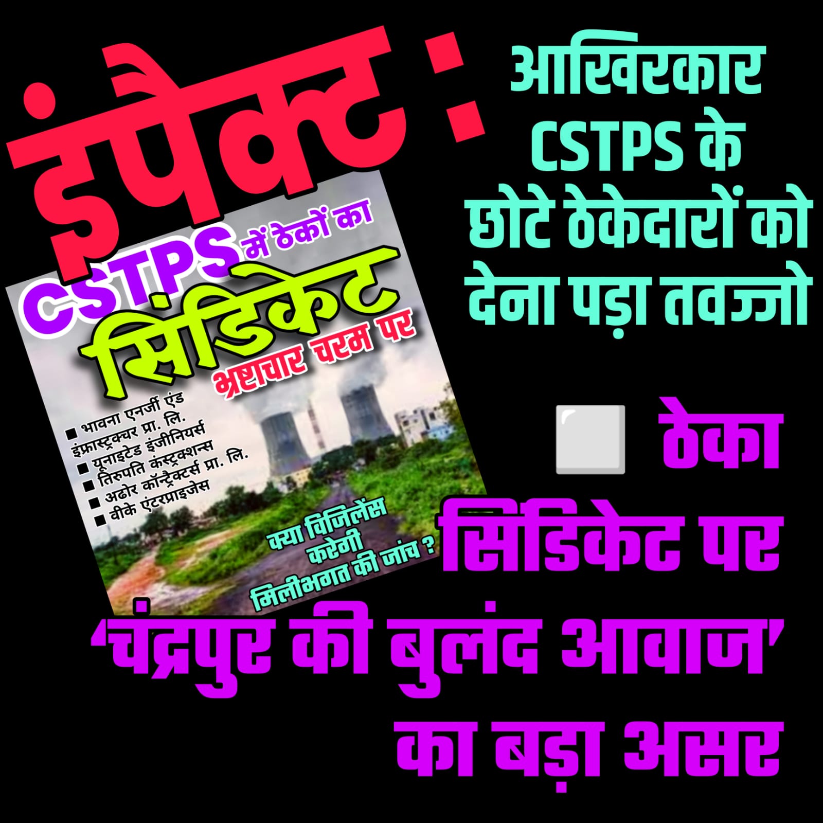 यह स्थिति साबित करती है कि चंद्रपुर की बुलंद आवाज की पड़ताल ने न सिर्फ भ्रष्टाचार के पूरे जाल को उजागर किया, बल्कि सिस्टम को मजबूर कर दिया कि वे अब छोटे ठेकेदारों को भी साथ लेकर सफाई देने की कोशिश करें | CSTPS में भ्रष्टाचार और सिंडिकेट की जांच के लिए विजिलेंस विभाग की कार्रवाई अब और तेज होने की उम्मीद जताई जा रही है।