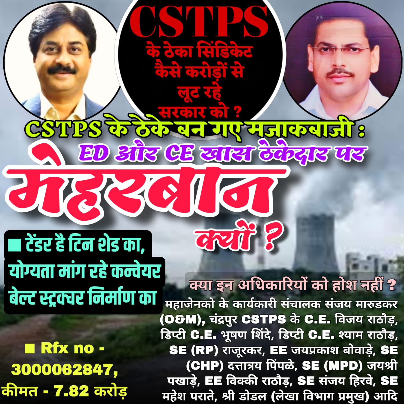 मुख्यमंत्री देवेंद्र फड़णवीस और उनके ऊर्जा विभाग के उच्च अधिकारियों की घोर अनदेखी के चलते अब चंद्रपुर CSTPS के ठेके मजाक बनकर रह गए हैं। एक्ट्रा इंकम अर्थात भ्रष्ट ढंग से कमाने की चाह में करोड़ों के ठेके मनमाने ढंग से अपने पसंदीदा ठेकेदार को रिंग प्रणाली के माध्यम से खैरात की तरह बांटे जा रहे हैं। इसके बावजूद महाजेनको के कार्यकारी संचालक संजय मारुडकर (O&M) एवं CSTPS के C.E. विजय राठौड़ इस सिंडिकेट को क्यों नहीं तोड़ पा रहे हैं ? यह सोचने वाली बात है। सच तो यही है कि C.E. विजय राठौड़ ने जारी ई-टेंडर के नियम को ऐसा बना दिया कि एक खास ठेकेदार को ही ठेका मिल सकें। इससे स्पर्धा व बोलियां खत्म होकर सरकार को करोड़ों का नुकसान पहुंच रहा है। ताजा मामला है टिन शेड़ ठेके का। Rfx no -3000062847 की कीमत – 7.82 करोड़ दर्ज है। यह ठेका 22 नवंबर 2025 की मियाद का है। कार्य विवरण में सीएचपी की बेल्ट कन्वेरी स्ट्रक्चर छत के नवीनीकरण और आधुनिकीकरण का काम दर्ज है। साफ शब्दों में कहे तो CHP के टिन शेड़ का कार्य करना है। लेकिन C.E. राठौड़ ने इसके लिए योग्यता के कॉलम में कन्वेयर बेल्ट स्ट्रक्चर निर्माण के अनुभव जोड़ दिया है। इससे ठेकेदारों के बीच स्पर्धा खत्म कर एक खास ठेकेदार को ठेका दिलाने का रास्ता साफ हो गया। ठेका सिंडिकेट फिर से जीत गया और छोटे ठेकेदार रेस शुरू होने के पहले ही हरा दिए गए।