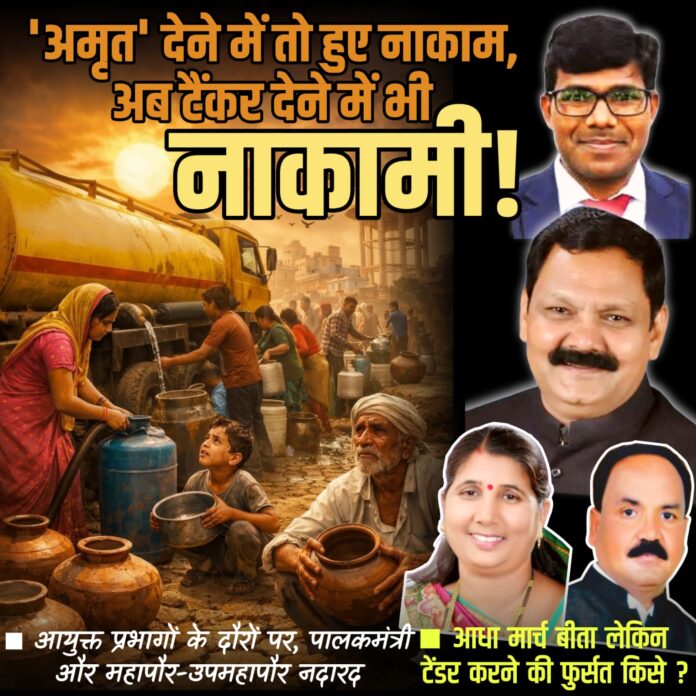 मनपा की सत्ताधारी भाजपा वर्ष 9 वर्ष पूर्व चंद्रपुर की जनता को 24 घंटे शुद्ध पेयजल दिलाने का ख्वाब दिखाया करती थी। एक साल में अमृत पेयजल योजना के प्रोजेक्ट को पूरा करने का दावा किया जाता था। परंतु वादों और दावों के बीच करोड़ों की सरकारी धनराशि पानी की तरह बहा देने के बावजूद चंद्रपुरवासियों को नियमित पेयजल नहीं मिल पा रहा है। ऐसे में हर साल टैंकरों से की जाने वाली जलापूर्ति इस वर्ष आधा मार्च माह बीत गया, लेकिन टेंडर प्रक्रिया पूर्ण नहीं हो सकी। जलसंकट प्रारूप के नियोजन की फाइल न जाने कहां अटका दी गई। मनपा प्रशासन एवं सत्ताधारियों की यह घोर लापरवाही केवल और केवल नाकामियों का इतिहास गढ़ रही है। अमृत देने में नाकाम हुआ शासन व प्रशासन अब टैंकर देने में भी नाकाम ही साबित होने लगा है। हैरत की बात यह है कि इस गंभीर पेयजल संकट के दिनों में मनपा आयुक्त अकुनूरी नरेश शहर के प्रभाग-प्रभाग का दौरा करने में व्यस्त नजर आते हैं। वहीं जिले के पालकमंत्री डॉ. अशोक उइके इस मुद्दे को गंभीरता से लेने के लिए दूर-दूर तक उनके दर्शन दुर्लभ हो चुके हैं। और तो और नवनियुक्त महापौर संगीता खांडेकर तथा उपमहापौर प्रशांत दानव आयुक्त के साथ दौरा करते दिखाई नहीं पड़ रहे हैं। जलसंकट को हल करने के मुद्दे पर वे भी नदारद ही दिख रहे हैं।