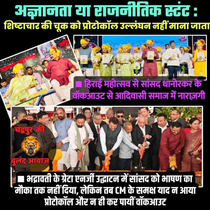 अब जब राजमाता रानी हिराई महोत्सव में सांसद प्रतिभा धानोरकर के वॉकआउट को लेकर आदिवासी समुदाय में नाराज़गी का सुर दिखाई पड़ रहा है, वहीं यह सवाल भी ज़ोरदार ढंग से उठाया जाने लगा है, या यूं कहें तो सांसद की नीति पर आम जनता में चर्चा होने लगी है कि जब भद्रावती में CM देवेंद्र फडणवीस की मौजूदगी में उन्हें भाषण देने नहीं दिया गया, तो तब सांसद धानोरकर ने वॉकआउट क्यों नहीं किया? उस समय भी तो यह प्रोटोकॉल से संबंधित मामला था। चूंकि चंद्रपुर लोकसभा संसदीय क्षेत्र अर्थात भद्रावती में कार्यक्रम हो रहा था और स्थानीय सांसद धानोरकर को अपने विचार रखने का मौका भी नहीं दिया गया। 14 मार्च 2026 को आयोजित इस कार्यक्रम पर तो सांसद महोदया ने कोई नाराज़गी नहीं जताई और न ही लोकसभा के अध्यक्ष से इसकी शिकायत की।