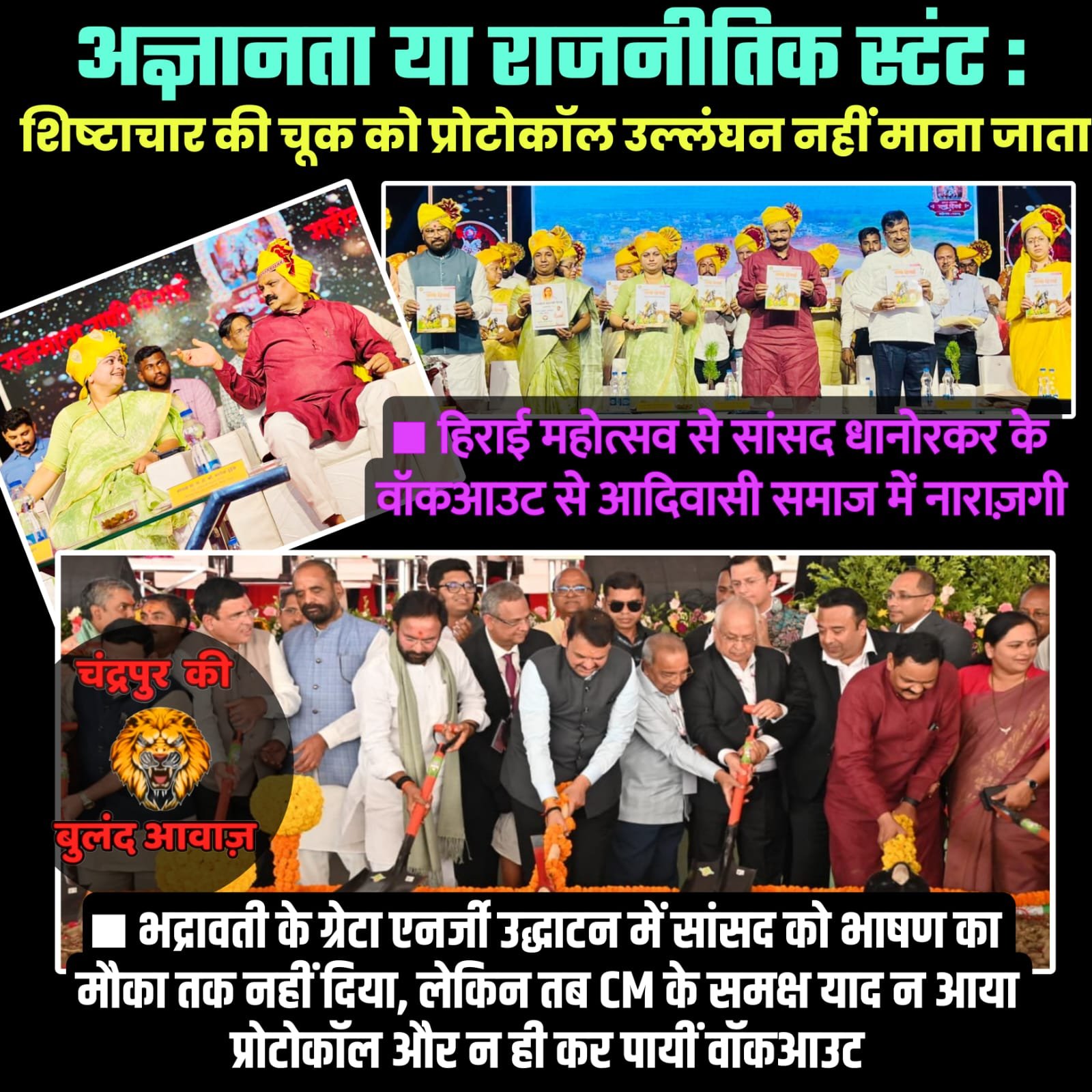 हैरत करने वाली बात तो यह है कि 14 मार्च 2026 को सांसद प्रतिभा धानोरकर के गृह क्षेत्र भद्रावती के MIDC परिसर में जब न्यू एरा क्लीनटेक प्रा. लि. एवं ग्रेटा एनर्जी प्रा. लि. परियोजनाओं का भूमिपूजन प्रदेश के मुख्यमंत्री देवेंद्र फडणवीस की मौजूदगी में आयोजित किया गया था, तब तो सांसद महोदया को भाषण करने का मौका तक नहीं दिया गया। स्थानीय सांसद को दरकिनार किए जाने के इस मामले में धानोरकर ने न तो इस उद्योगपतियों के कार्यक्रम का बहिष्कार किया, न इस कार्यक्रम से वॉकआउट किया और न ही लोकसभा अध्यक्ष से इसकी शिकायत की। इसके चलते आदिवासी समुदाय अब इस दोहरी नीति को लेकर सवाल पूछने लगा है। चर्चा करने लगा है कि आदिवासी समुदाय के कार्यक्रम में ही वॉकआउट क्यों? उद्योगपतियों के कार्यक्रम में क्यों नहीं किया वॉकआउट?